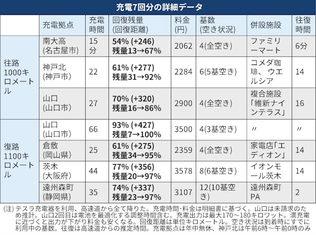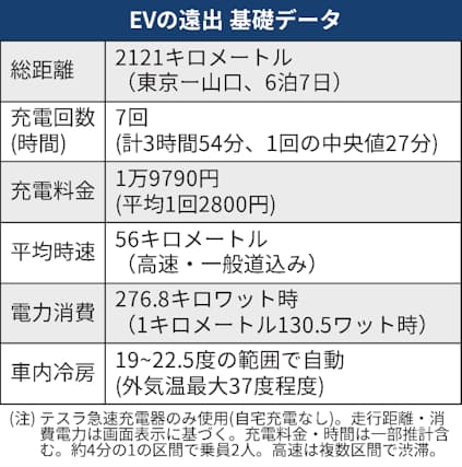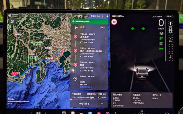 9日未明に都内を出発した。出発時の電池残量は75%。往路の充電時間は1時間1分、充電を除く休憩は約1時間で、同日午後6時に山口県の実家に到着した。到着時の充電残量は79%だった。