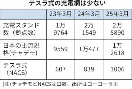 だが、落とし穴があった。テスラの急速充電は日本の主流規格のチャデモを使えず、自前規格(NACS)しか現時点で充電できない。全国1000口程度しかなく、テスラの自前充電器(スーパーチャージャー)が高速道路上に全くない。