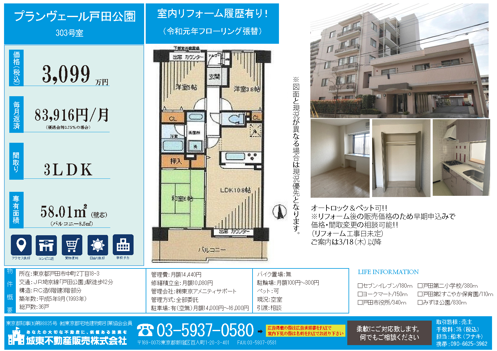 公開日 2021年03月11日 お世話になっております。 プランヴェール戸田公園 「戸田公園」駅 徒歩12分 平成5年9月築 ペット可のマンションです。 3階部分で南向きのため日当たり良好です! 3/18~ご案内可能です! 城東不動産販売株式会社 ~住まいに対する想いを一緒に。~ 〒169-0073 東京都新宿区百人町1-20-3-401 TEL:03-5937-0580(代表) FAX:03-5937-0581 Mail:koike@0359370391.com