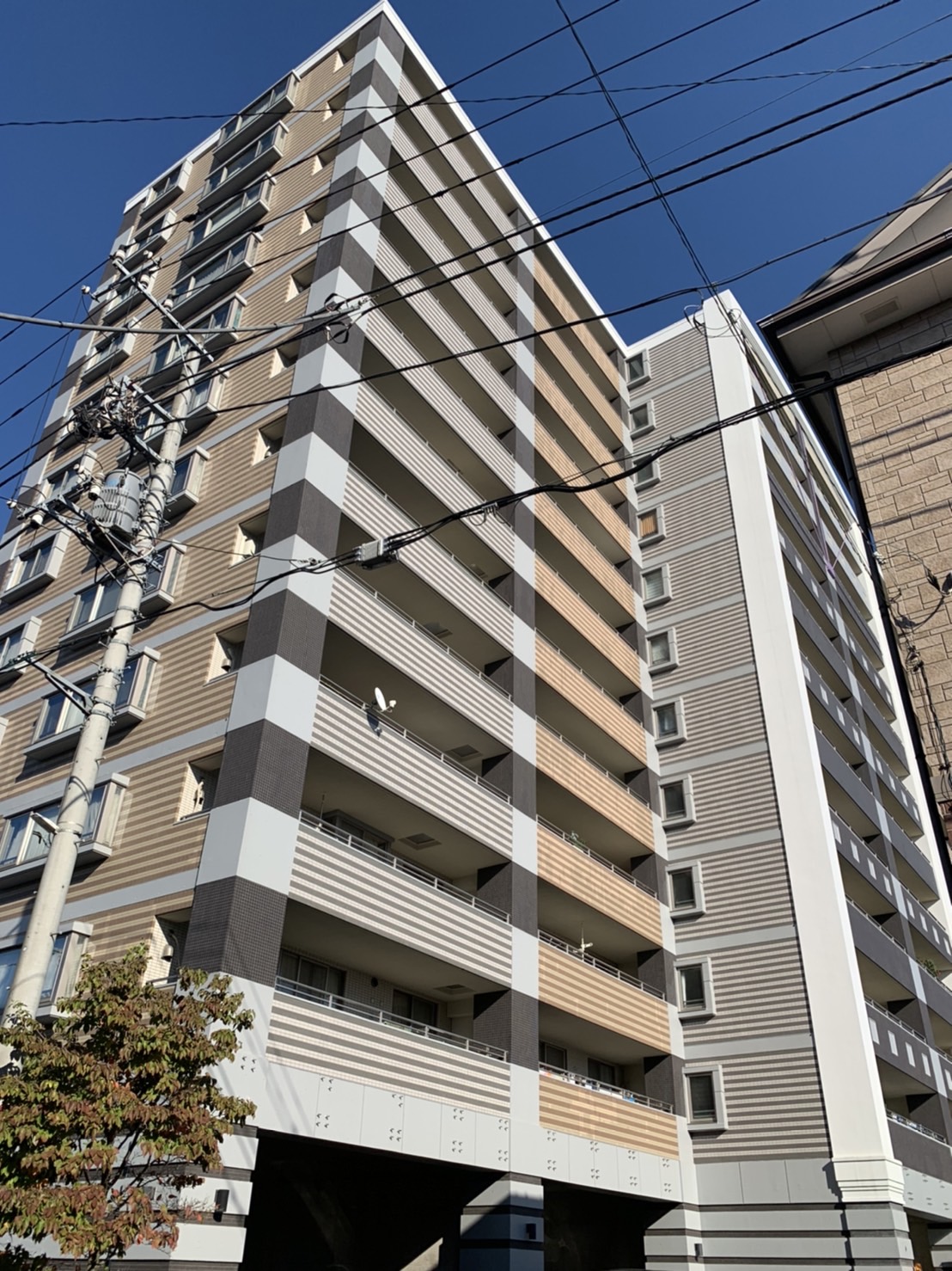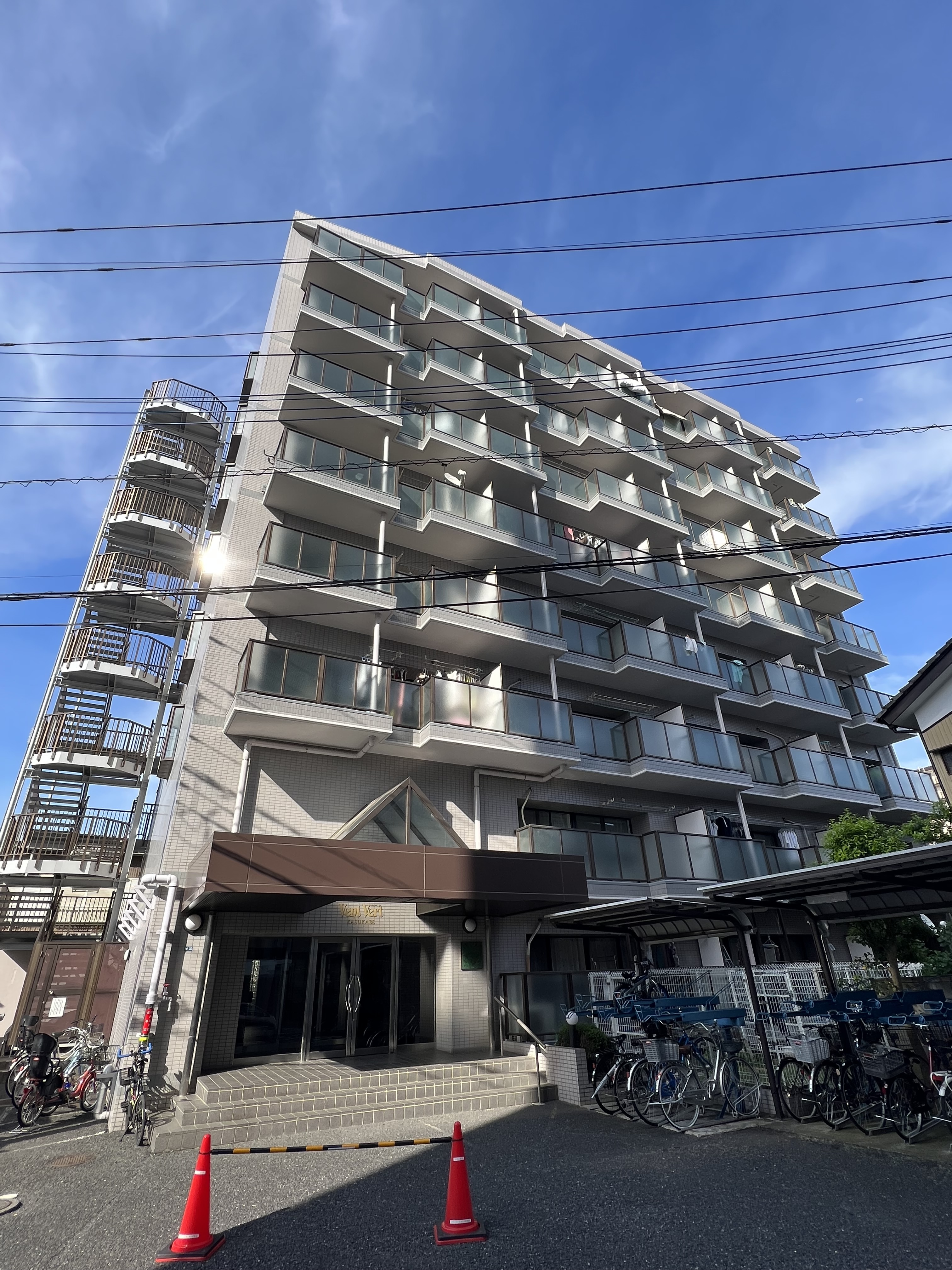 築浅という事もありタイル張りでおしゃれな外観です。エントランスも少し特殊でブルーライトで照らされるようです。