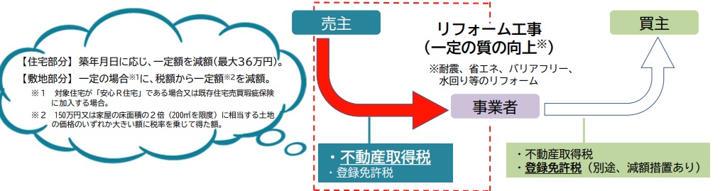 買取再販で扱われる住宅・敷地のうち、一定の質の向上を図るリフォームを行った後、個人の自己居住用住 宅として譲渡するものについて、不動産取得税(宅地建物取引業者の取得に係るもの)を以下のとおり減額。