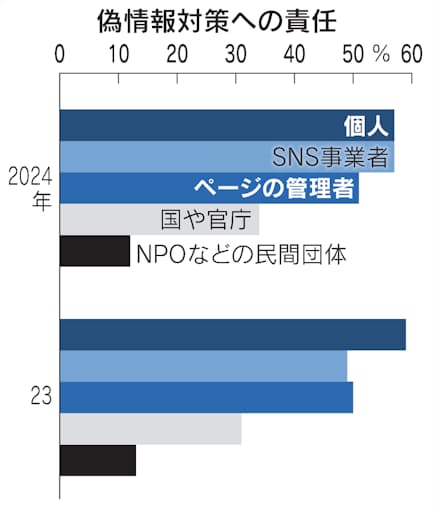 某新聞で偽情報などへの対策についてSNSのサービスを提供する企業に責任を求める割合が23年調査から上昇した。これまで最も多かった「閲覧する個人の責任」とする回答と並んだ。