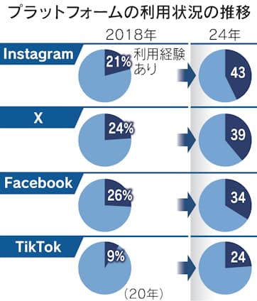 利用経験があるプラットフォームを聞くと、TikTokやインスタグラムの浸透が目立った。TikTokは24%で質問項目に入れた20年(9%)から大きく伸びた。インスタグラムは43%で調査開始の18年(21%)から倍増した。