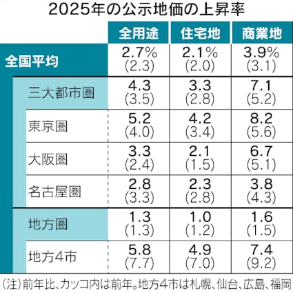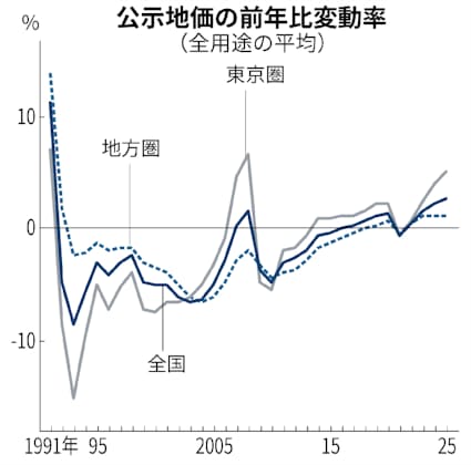 国土交通省が18日発表した2025年1月1日時点の公示地価は、全用途の全国平均が前年比で2.7%上昇した。伸びは前年の2.3%を上回り、バブル崩壊後の1992年以降で最高となった。人口減が進んでも、円安や低金利で調達コストの安い日本市場に海外からの投資マネーが集まっている。