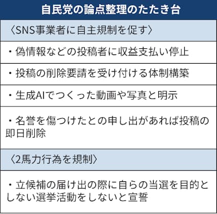 自民党は選挙に関するSNSの偽情報対策に向けた論点整理のたたき台をまとめた。SNS事業者に自主規制を求め、具体策として閲覧数などに連動した投稿者への収益の支払い停止を例示した。個人の名誉を傷つける投稿は即日削除を促すとも記した。