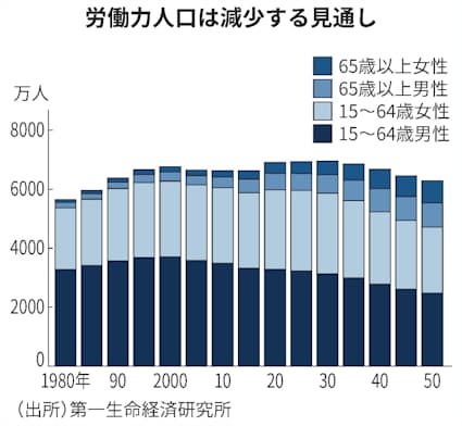 23年に6925万人だった日本の労働力人口は35年から減少局面に入り、50年は6287万人まで低下する。