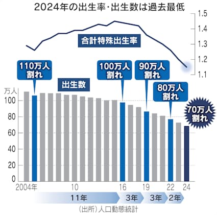 2024年の出生数が初の70万人割れ 出生率最低1.15、揺らぐ経済基盤
