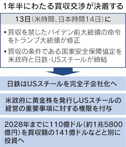 大統領令が出された直後、日鉄は米政府との間で国家安全保障協定を結び、買収の承認を得た。日鉄とUSスチールが結んでいる合併契約の中では「買収の(最終的な手続きである)クロージング日は関係当局の許認可を取得したのち、3営業日後になる」となっている。買収金額の払い込みを含め、18日に全手続きが完了する見通し。
