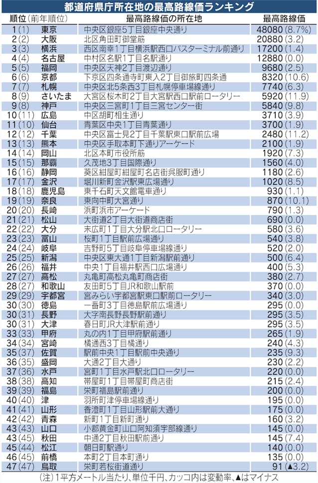 路線価が全国一高かったのは東京都中央区銀座5の文具店「鳩居堂」前で1平方メートル当たり4808万円だった。全国首位は40年連続。前年比8.7%プラスで、伸び率も同5.1ポイント上回った。世界的な半導体企業が進出する熊本県菊陽町も同22.6%伸びた。