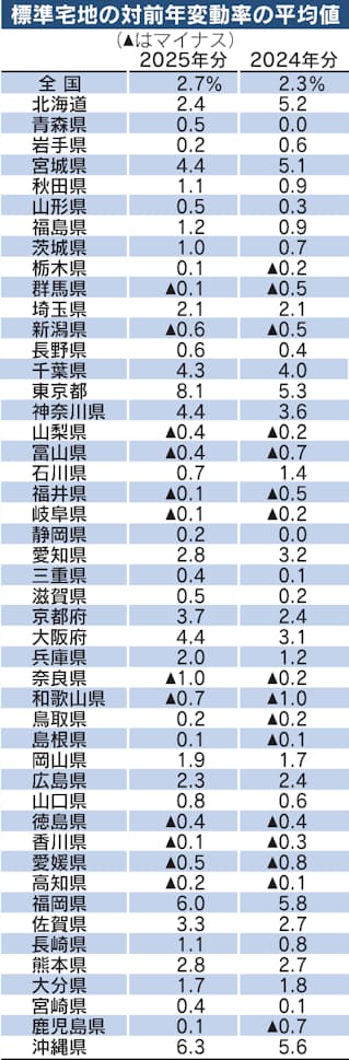 インバウンド(訪日外国人)客が各地で活況だったほか、都心の物件価格高騰や、大都市圏近郊も含めた再開発の活発化で上昇地点が全国に広がった。標準宅地の変動率を都道府県別で見ると35都道府県で上昇し、昨年より6県増えた。下落は4県減って12県だった。